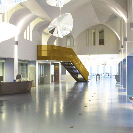 The grand hall represents the internal gallery that runs through the whole edifice. The University President wanted to emphasize the communal side of student life: hall, mezzanine, quadrangle, amphitheater, tutorial rooms, library and learning center. Nevertheless this type of building remains a place for silence and concentration.