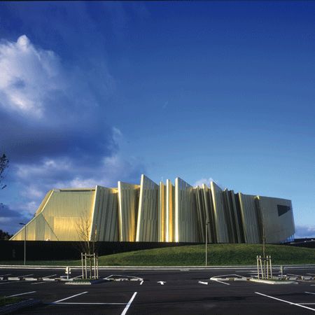 Délibérément spectaculaire pour attirer les foules, le bâtiment, nommé « Scarabée », brille de mille feux. La salle modulable de 8000 places a été pensée au carré et se prête à de multiples configurations. L’architecte, lui a taillé un habit de lumière festif et sur mesure, un plié laqué or aux nuances changeantes au gré de la lumière.