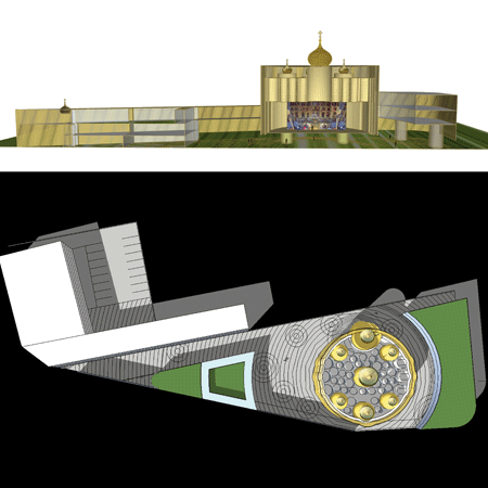 A l’angle de deux rues, le Centre culturel orthodoxe développe une salle d’exposition, un centre de recherches, une bibliothèque, une salle de conférences autour d’une église qui libère le sol et semble être en suspension. La structure en béton est enveloppée d’une carapace de verre sérigraphié qui lui donne à la fois son côté aérien et ses qualités bioclimatiques.