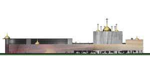 Located at the angle of two streets, the Church, which appears to float free of the ground, suspended, is located at the heart of an Orthodox Cultural Center that comprises new exhibition space,