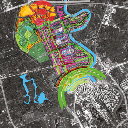 A new development in the center of China, this represents 10,000 habitations and the prospect of urban and architectural diversity based on the pleasure of exploring an urban environment. Beyond the city limit, a countryside landscape within which a luxury 400-room hotel will be situated, a metaphor for Charles Quint’s Palace in the Alhambra Gardens.