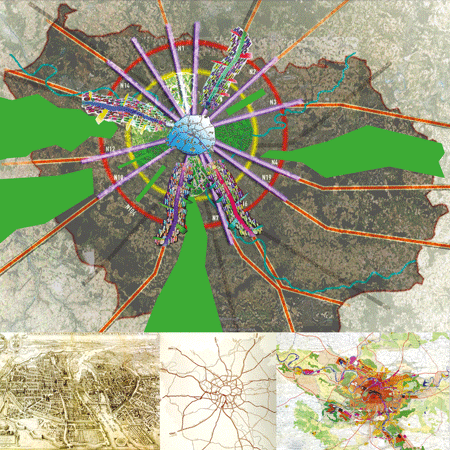 The traditional radio-concentric city should retrieve its natural layout, refocusing on its radial routes and taking into account both the slowing in and the expansion of the center. Reflecting on the town is to gain strength from what disrupts our space: horizontal speed and vertical momentum with their compensatory dimensions, nature in all its forms.
