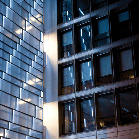 staircase. The staircase has a beacon-like appearance. It is covered with a silkscreen printed glass screen and it responds to a metaphor that the passersby are invited to experience. This is a technical and poetic response to the architectural and safety constraints. The presentation signals the renewal of the equipment but it also becomes a luminous glass showcase when it is elaborately lit up at night. The staircase becomes an urban articulation while at the same time responding to a technical need.
