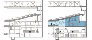 L’évolution de la règlementation sur les ERP (Etablissements Recevant du Public) et la remise aux normes en matière de sécurité incendie sont à l’origine de cette réhabilitation, avec les contraintes d’un chantier en site occupé. La nécessaire augmentation du nombre d’unités de passage a conduit à créer un escalier extérieur en